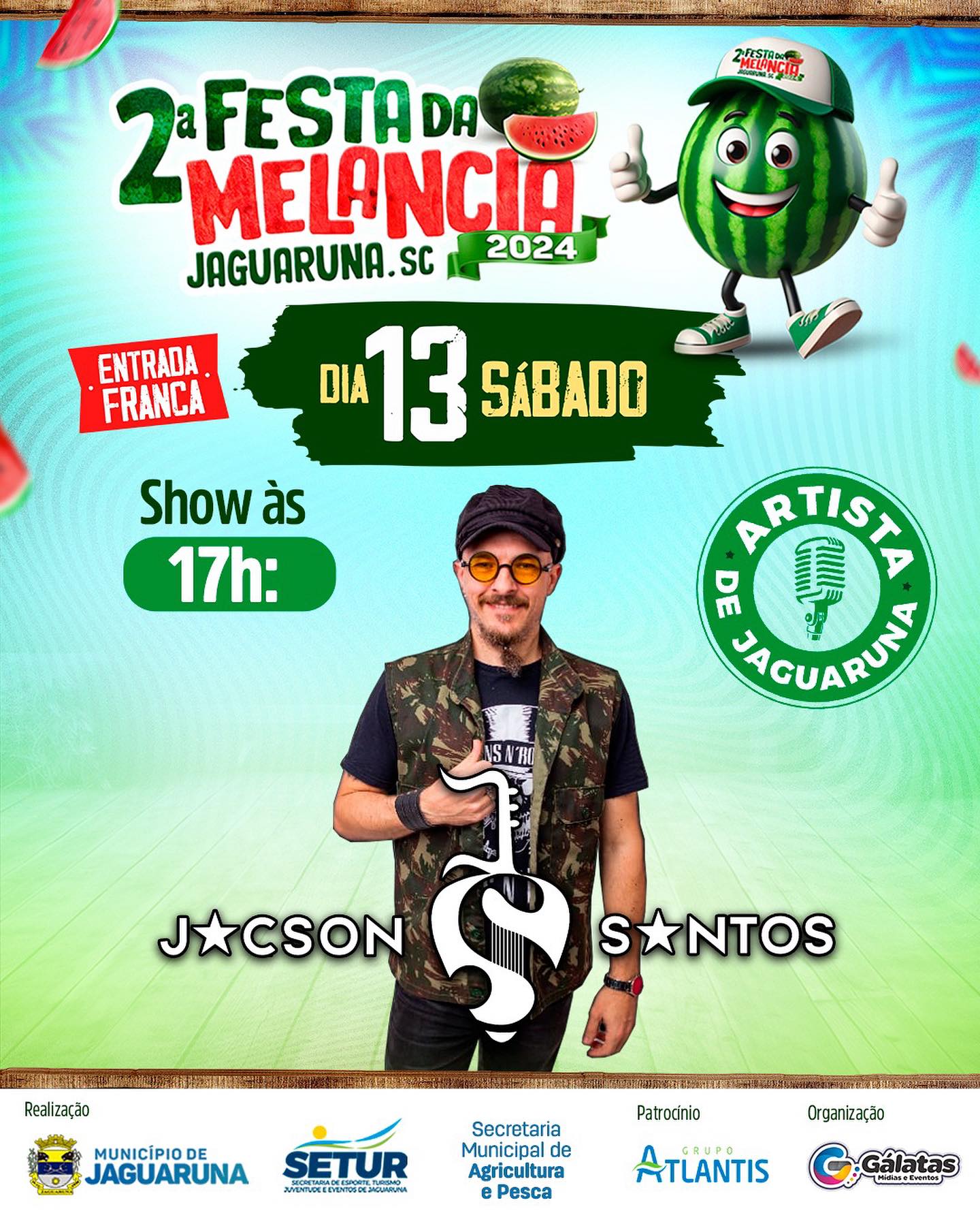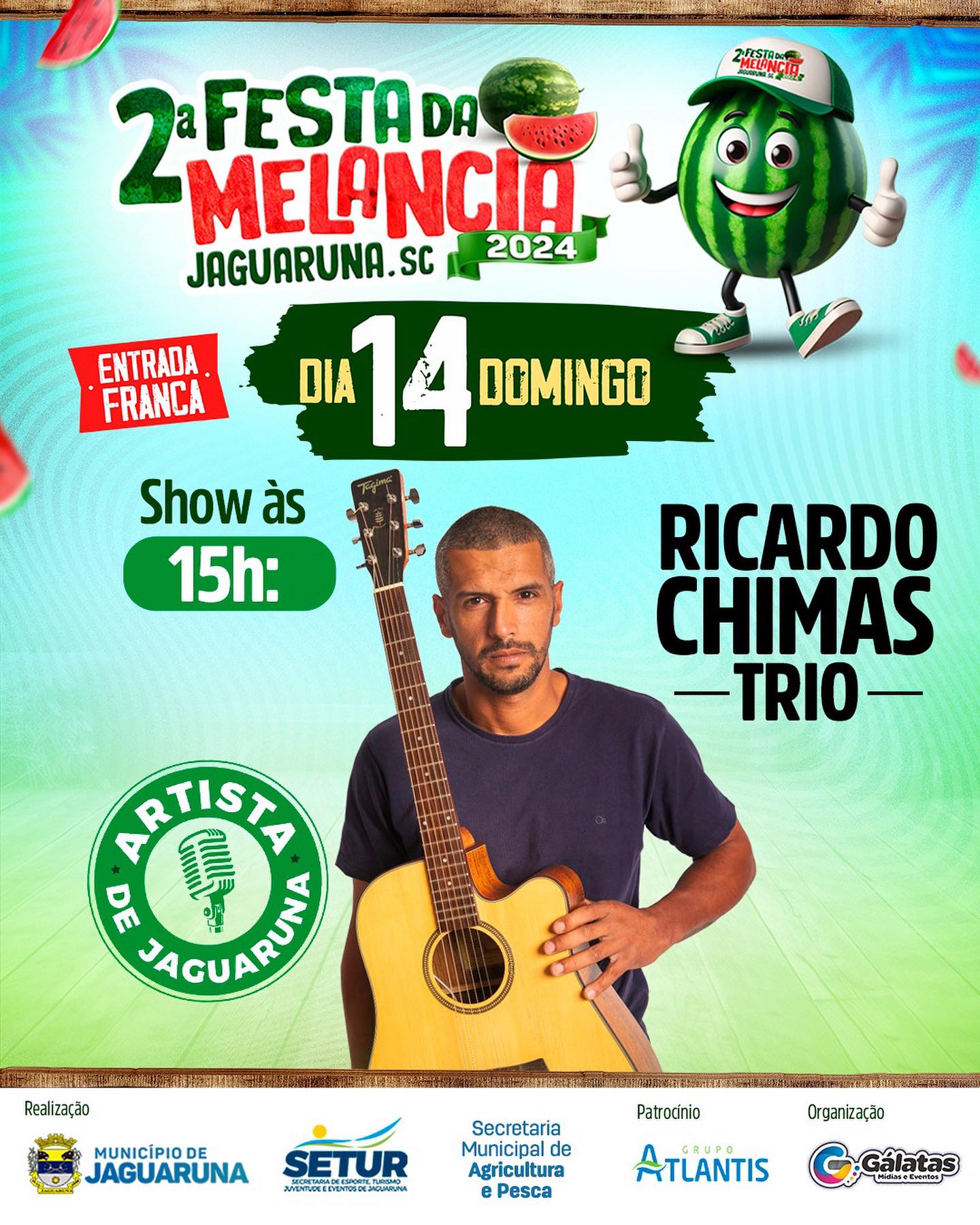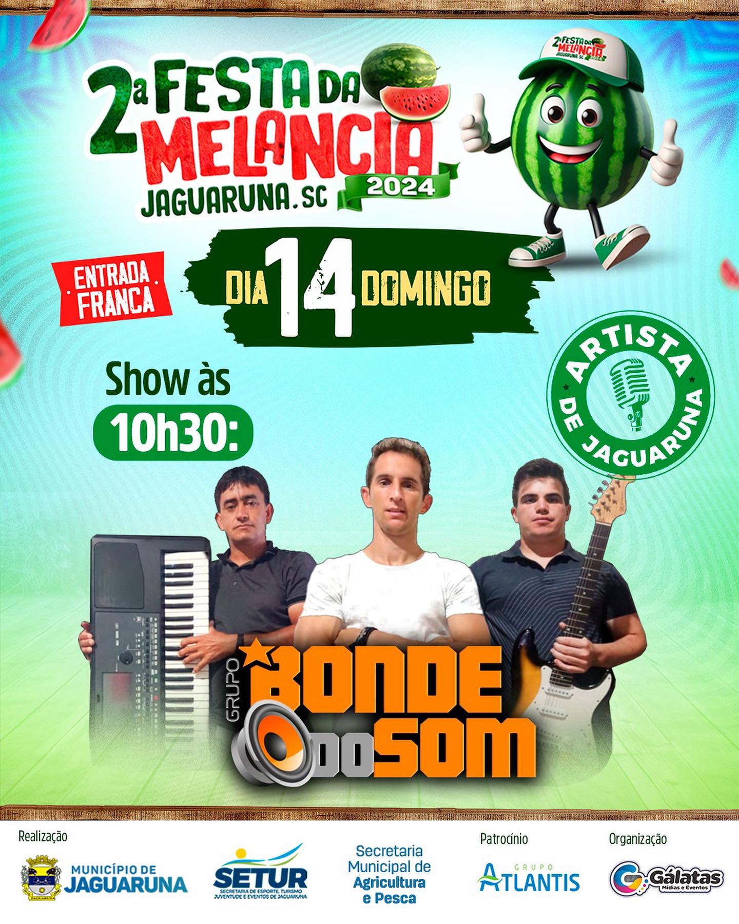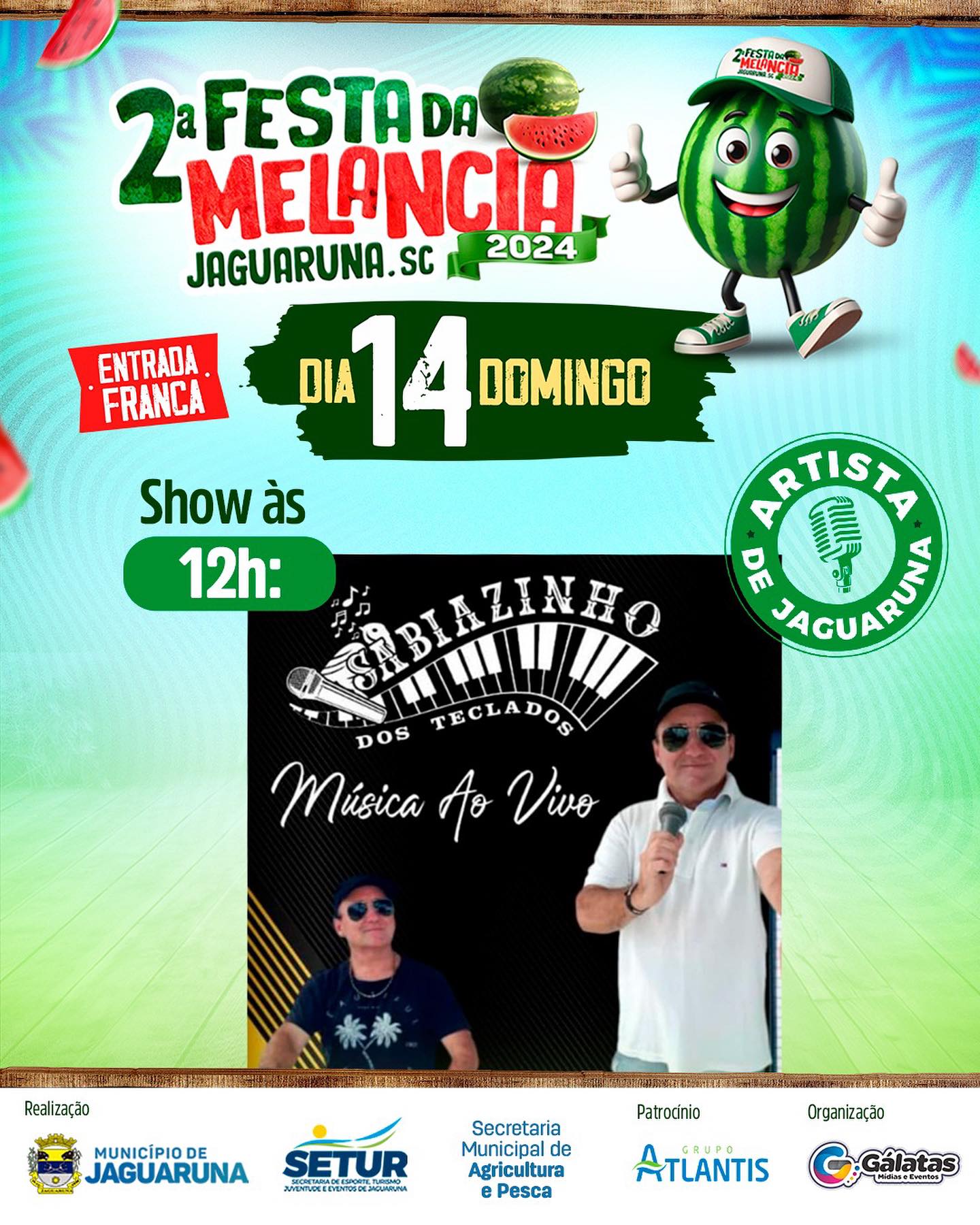 Temos a honra de receber na 2ª FESTA DA MELANCIA diversos artistas locais que irão trazer muita música de qualidade para o evento que leva a essência de Jaguaruna.