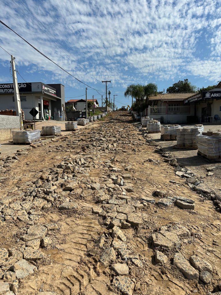A Prefeitura de Sangão, por meio da Secretaria de Obras e da Intendência Distrital, iniciou nesta semana os trabalhos de retirada das lajotas antigas da Rua Maximiliano Scremin. Após essa etapa inicial, a empresa vencedora do processo licitatório será responsável por executar a nova drenagem pluvial e a colocação do