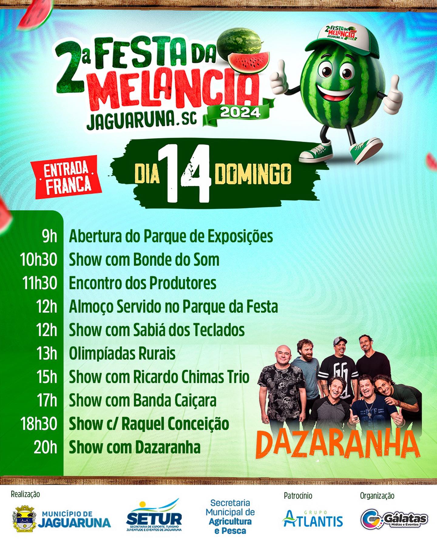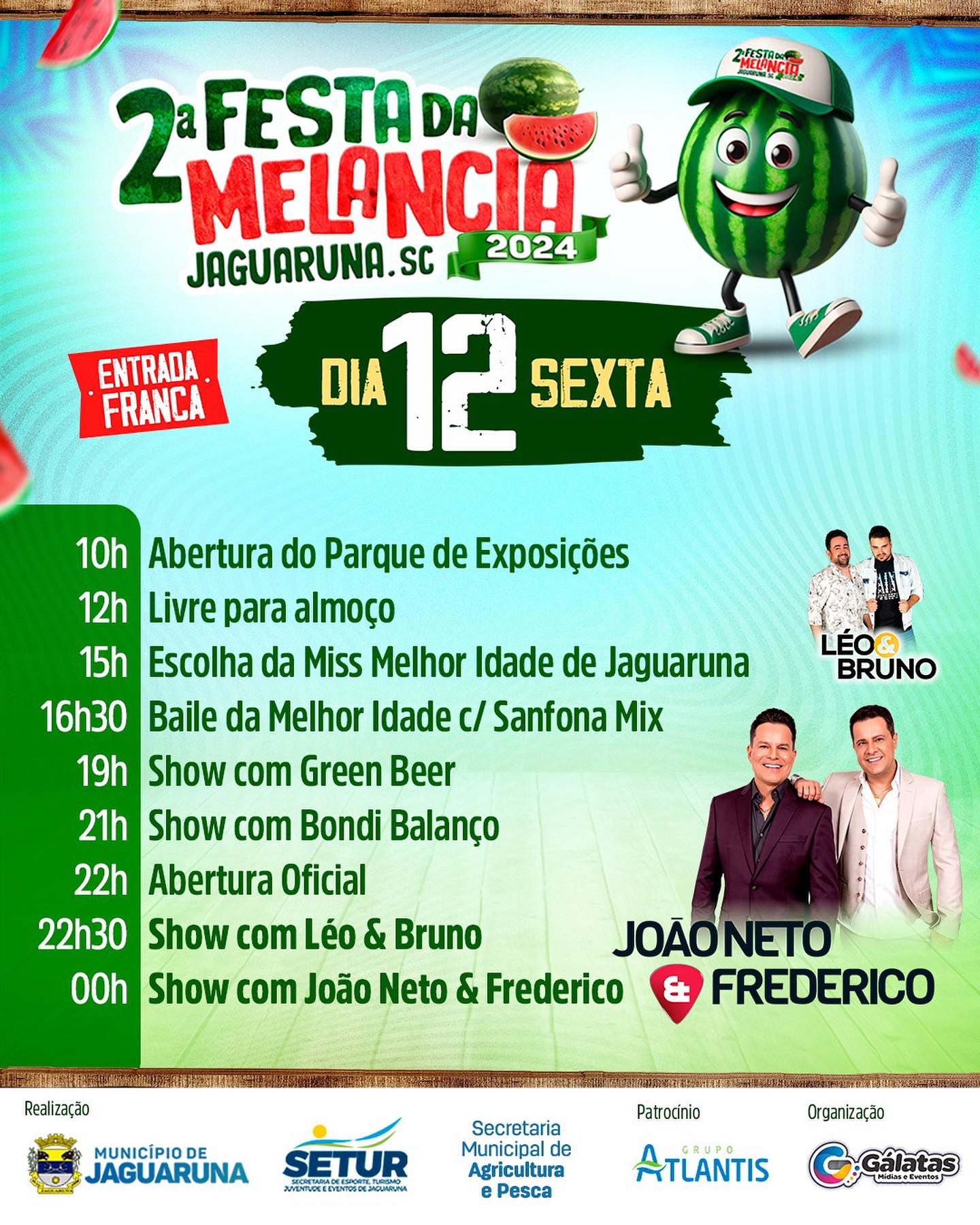De 12 a 14 de Janeiro, nossa cidade vai pulsar com três dias de muita diversão, música e sabores irresistíveis! Confira a PROGRAMAÇÃO COMPLETA da 2ª Festa da Melancia nas imagens desta publicação.