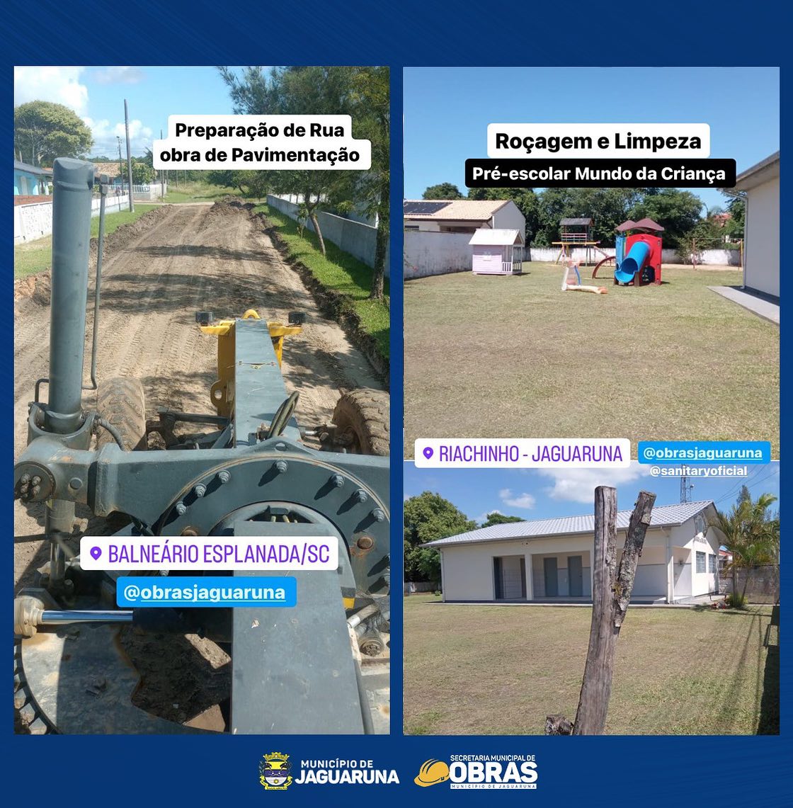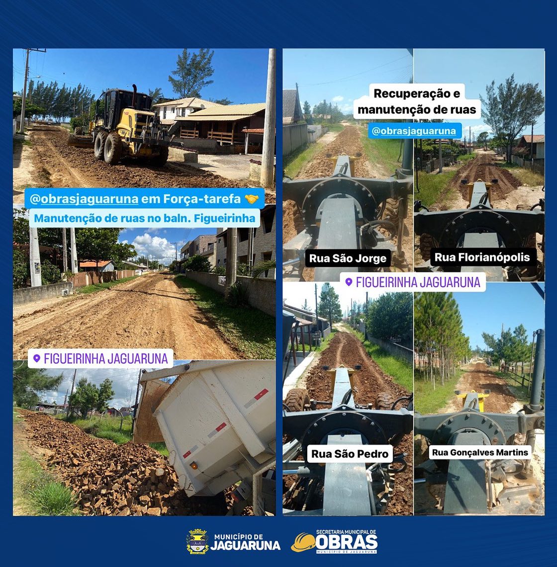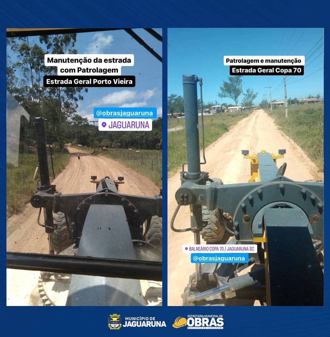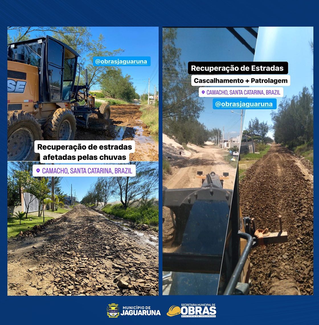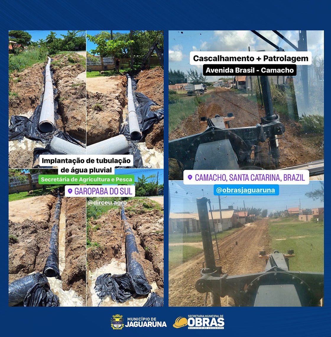 Ao longo desta semana, a Secretaria Municipal de Obras de Jaguaruna esteve ativamente, com todo maquinário mobilizado, envolvida na recuperação e manutenção de nossas estradas, contando também com apoio da Secretaria Municipal de Agricultura e Pesca com a abertura e limpeza de rios e córregos.