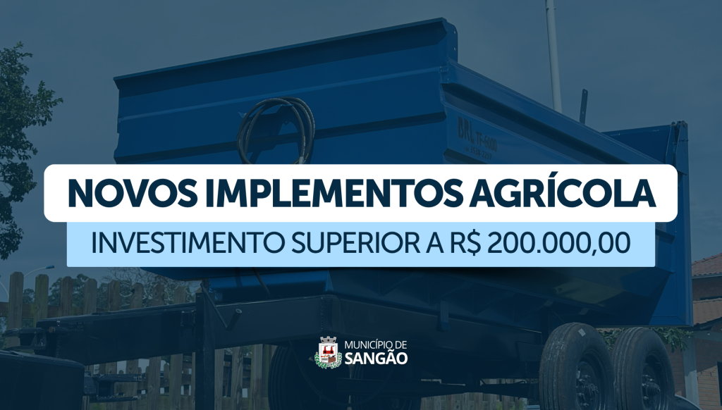 A Prefeitura de Sangão, por meio da Secretaria de Agricultura, realizou a aquisição de novos implementos agrícolas que irão reforçar o atendimento aos produtores rurais do município. O investimento contempla uma plantadeira de grãos (R$ 29.000,00, ainda a ser entregue), uma enciladeira (R$ 97.950,00), duas carretas de silagem (R$ 47.490,00) e uma grade aradora (R$ 29.100,00).