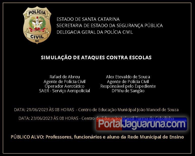 Esta semana, a Polícia Civil de Sangão estará realizando uma ação de simulação de ataques à escola, visando promover a segurança e o preparo de professores, funcionários e alunos da rede municipal de ensino. Essa iniciativa é fundamental para nos prepararmos para qualquer eventualidade, garantindo a proteção de todos os envolvidos.